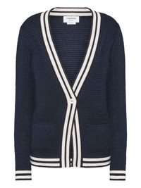 tuck-stitch V-neck cardigan Highlights - Navy blue - V-neck - Stripe detail - Button fastening - Ribbed cuffs Made in Italy Composition Fabric 100%
