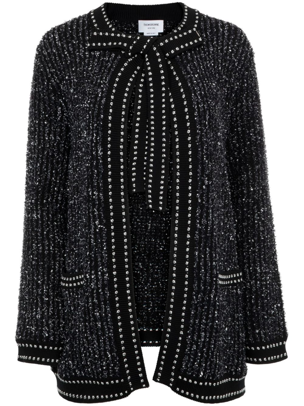 tweed-detail open cardigan Highlights - Black - Tweed texture - Contrasting trim - Bow tie closure - Long sleeves - Front patch pockets - Ribbed cuffs - Open front design Made in Italy Composition Cotton 79%, Polyamide 16%, Viscose 4%, Polyester 1%