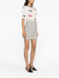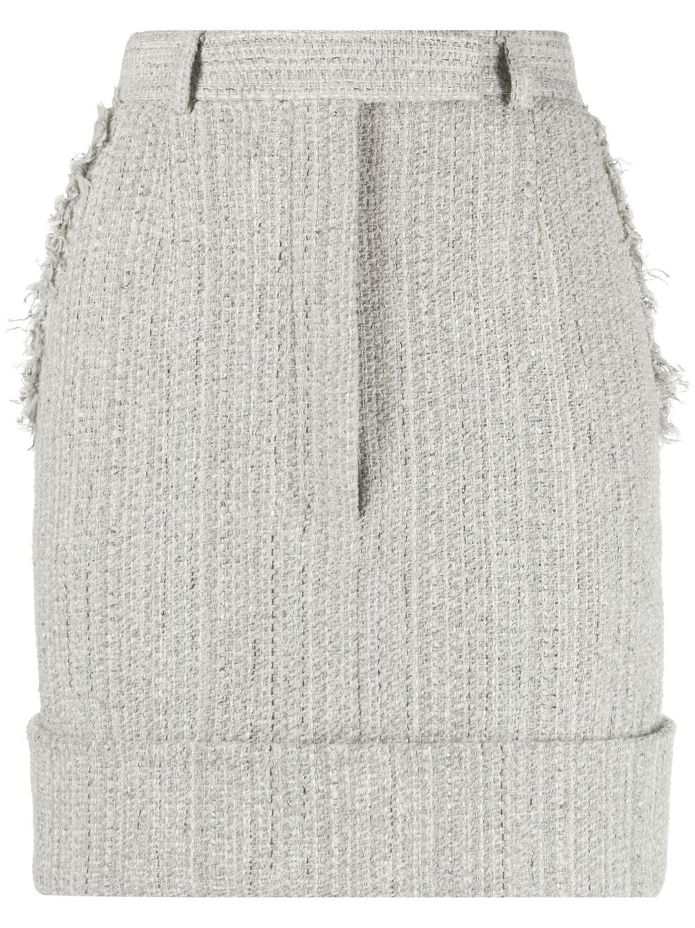 tweed mini skirt Imagined in a grey and white colourway, this THOM BROWNE mini skirt sits high on the waist and falls to a slim-fitting silhouette. The preppy tweed construction is balanced by the frayed edges on the side. Highlights - Light grey/off-white - Silk - Tweed - Frayed edge - Signature grosgrain loop tab - High waist - Belt loops - Concealed front fastening - Two side slit pockets - Two rear button-fastening jetted pockets - Straight hem - Thigh-length Made in Italy Composition Outer: Cotton 61%, Polyester 21%, Polyamide 7%, Acrylic 6%, Viscose 3%, Wool 1%, Acetate 1% Lining: Silk 100% SIZE & FIT Model measurements Height 5 ft 10 in(1.78 m) Bust/Chest 31.49 in(80 cm) Hips 35.03 in(89 cm) Waist 23.62 in(60 cm) FittingInformation This mini-length skirt is intended to be worn high on the waist Made from a midweight non-stretch fabric This piece fits true to size – take your usual size