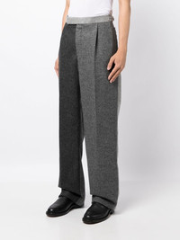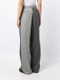 two-tone wool wide-leg trousers Thom Browne elevates a classic tailored silhouette with these grey trousers, crafted in a tonal panelled design that offers a relaxed touch to the wool construction. Highlights - Grey - Wool - Two-tone design - Panelled design - Mid-rise - Concealed front fastening - Slip pockets to the sides - Wide leg - Long length Imported Composition Wool 100% SIZE & FIT Model measurements Height 6 ft 2 in(1.87 m) Bust/Chest 31.49 in(80 cm) Hips 37.79 in(96 cm) Waist 27.95 in(71 cm) FittingInformation Designed for a straight-leg, allowing for an unrestricted and comfortable fit over the leg The unfinished hems allow for the length to be altered Made from a midweight non-stretch fabric This piece fits true to size – take your usual size Washing instructions Dry Clean Only
