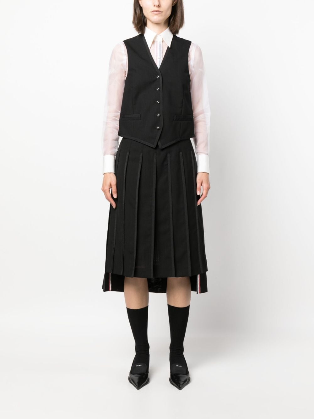 V-neck button-fastening waistcoat Signature details of Thom Browne, such as the grosgrain loop tab makes this waistcoat instantly recognisable as the brand. This is also highlighted through the use of a refined, minimalist palette. Highlights - Black - Wool - V-neck - Sleeveless - Front button fastening Composition Outer: Wool 100% Lining: Cupro 100% SIZE & FIT Model measurements Height 5 ft 10 in(1.77 m) Bust/Chest 33.5 in(85 cm) Hips 35 in(89 cm) Waist 23.6 in(60 cm) FittingInformation Designed for a slim fit that sits just away from the body offering a close yet comfortable fit Made from a midweight non-stretch fabric This piece fits true to size – take your usual size