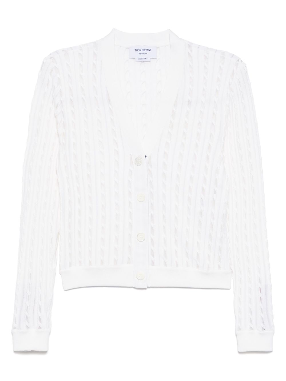 V-neck cardigan Highlights - White - Front button fastening - Ribbed cuffs and hem - Semi-sheer construction Made in Italy Composition Silk 60%, Cotton 40% SIZE & FIT Model measurements Height 5 ft 10 in(1.77 m) Bust/Chest 30.7 in(78 cm) Hips 35.82 in(91 cm) Waist 21.25 in(54 cm) FittingInformation Designed for a slim fit that sits just away from the body offering a close yet comfortable fit Made with a lightweight knit, this piece offers some stretch