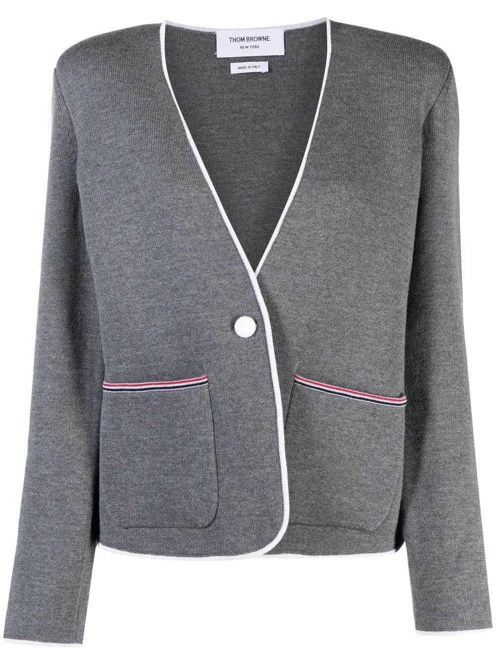 contrasting-trim collarless jacket Highlights - Medium grey - Merino wool blend - Melange effect - Striped tipping - Plunging v-neck - Two front pouch pockets - Front button fastening - Long sleeves - Straight hem Made in Italy Composition Virgin Wool 99%, Polyamide 1% SIZE & FIT Model measurements Height 5 ft 10 in(1.79 m) Bust/Chest 32.67 in(83 cm) Hips 34.25 in(87 cm) Waist 24.4 in(62 cm) FittingInformation This piece fits true to size. We recommend you get your regular size Cut for a slim fit Made with a mid-weight stretch fabric Washing instructions Dry Clean Only