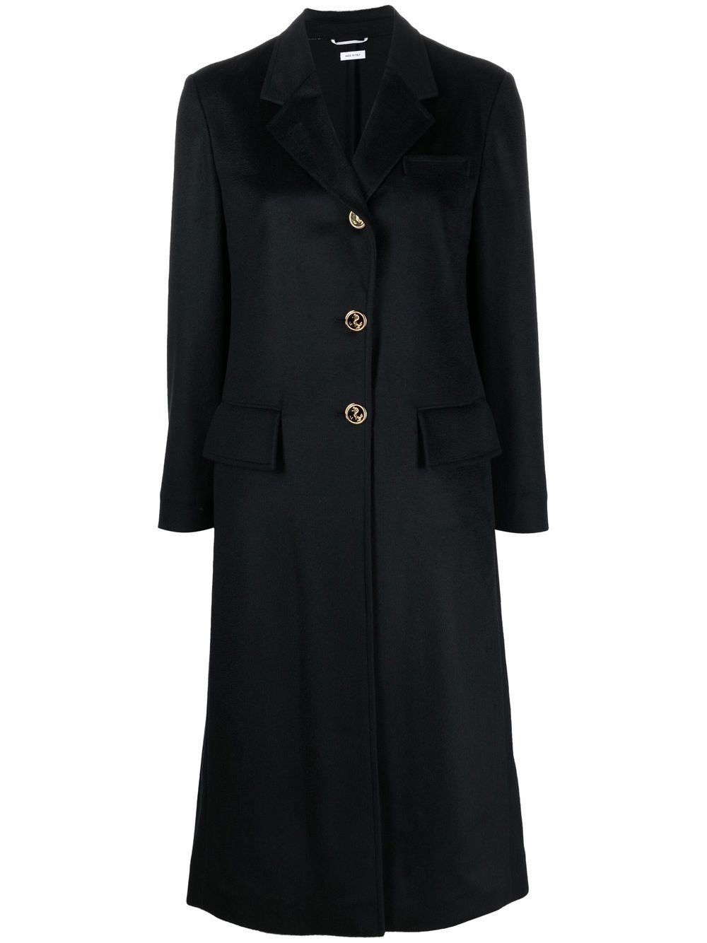 wide-lapel single-breasted overcoat wide-lapel single-breasted overcoat from THOM BROWNE featuring navy blue, cashmere, wide notch lapels, long sleeves, front button fastening and two front flap pockets. Made in Italy Composition Cashmere 100% SIZE & FIT Model measurements Height 5 ft 10 in(1.78 m) Bust/Chest 31.49 in(80 cm) Hips 37 in(94 cm) Waist 23.62 in(60 cm) FittingInformation This piece fits true to size. We recommend you get your regular size Cut for a loose fit Made with a mid-weight non-stretch fabric Washing instructions Dry Clean Only