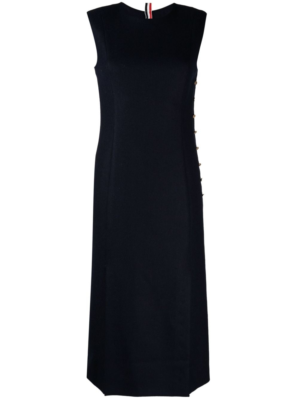 wool midi dress Thom Browne’s nuanced eye for tailoring comes to the fore with this navy wool-twill dress. Neat darts extend from the shoulders to the splits at the skirt, which reveal flashes of the RWB stripe silk lining. The buttoned plackets at the sides are lined with grosgrain trims to match the signature loop at the nape. Highlights - Navy blue - Wool - Twill weave - Rwb stripe - Signature grosgrain loop tab - Pleat detailing - Side button plackets - Round neck - Rear zip fastening - Sleeveless - Flared - Side slits - Straight hem - Mid-calf length - Silk lining Made in Italy Composition Lining: Silk 100% Outer: Wool 100% SIZE & FIT Model measurements Height 5 ft 10 in(1.78 m) Bust/Chest 29.13 in(74 cm) Hips 35.43 in(90 cm) Waist 23.62 in(60 cm) FittingInformation Designed for a slim fit that sits just away from the body offering a close yet comfortable fit Made from a midweight non-stretch fabric This piece fits true to size – take your usual size