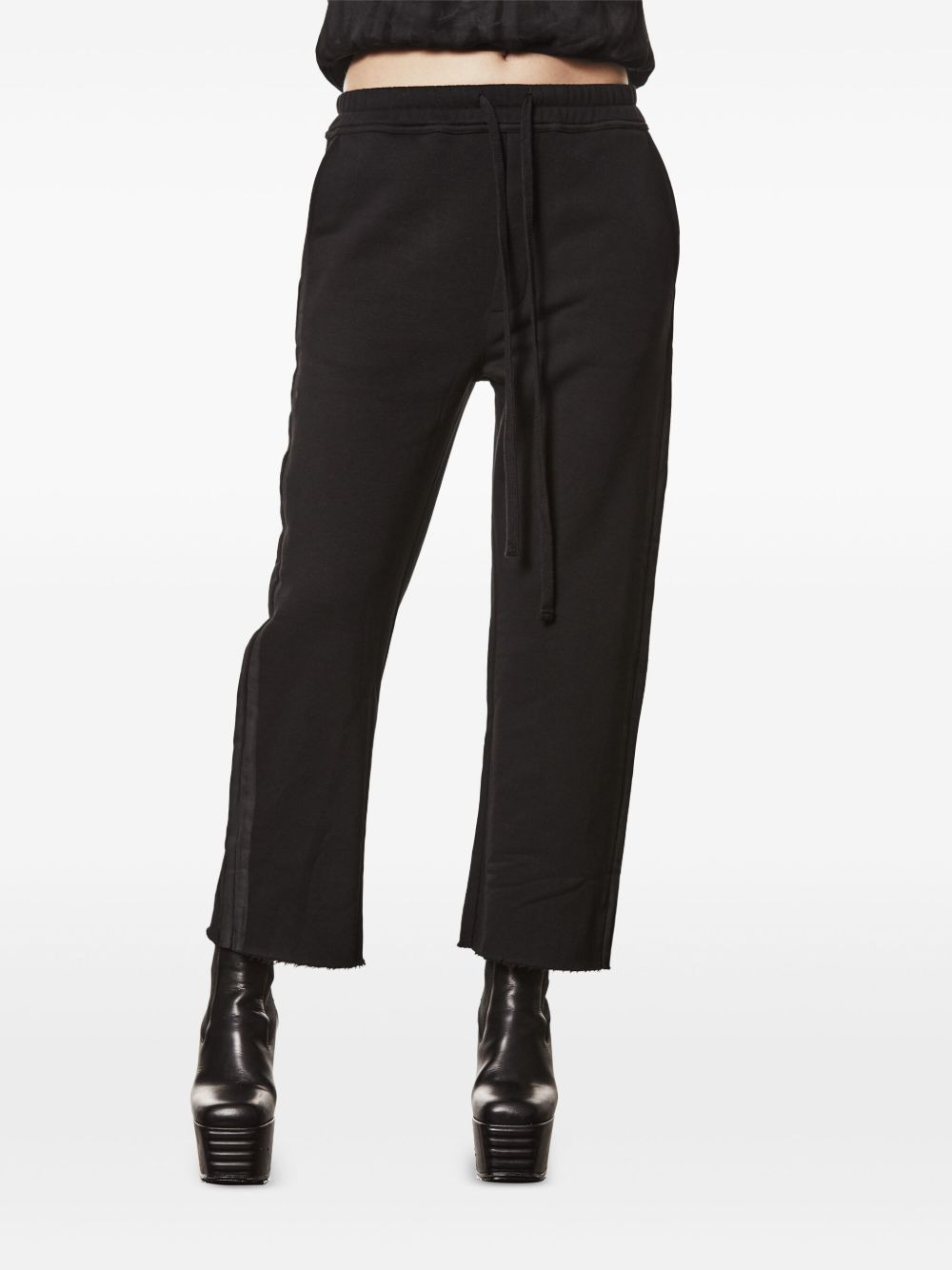 side-stripe raw-edge track pants Highlights - Black - Side stripe - Drawstring waist - Raw hem - Two side pockets Imported Composition Cotton 88%, Polyester 12% Washing instructions Read Manufacturer Guidelines