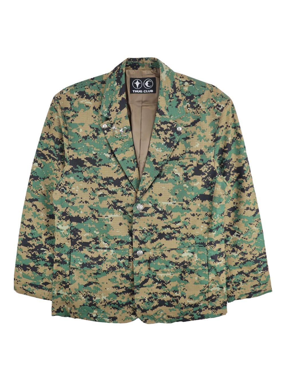 Army camouflage single-breasted blazer Highlights - Green - Cotton - Camouflage pattern - Button fastening - Notched lapel - Flap patch-pockets Imported Composition Body: Cotton 100% Washing instructions Read Manufacturer Guidelines