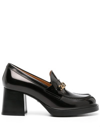 65mm logo-plaque leather pumps Tod's pumps are crafted from brushed leather and sit atop bold mid-block heels. Refined T Chain accessories decorate the uppers, while rubber outsoles are embossed with rubber pebbles – a nod to the brand's recognisable loafers. Highlights - Black - Calf leather - Stitched edge - Piped-trim detailing - Gold-tone logo plaque - Chain-link detailing - Round toe - Branded leather insole - Rubber outsole - 65mm mid block heel Made in Italy Composition Leather 100% SIZE & FIT Measurement HEEL 2.75 in(7 cm) Sole height 0.59 in(1.5 cm)