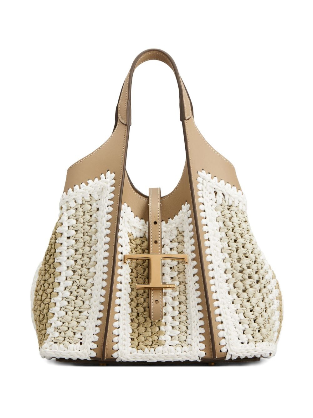 crochet-detail T-buckle tote bag Highlights - Beige - Crochet detailing - Leather trim - T-buckle fastening - Top handles - Detachable shoulder strap Made in Italy Composition Fabric 100%