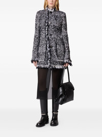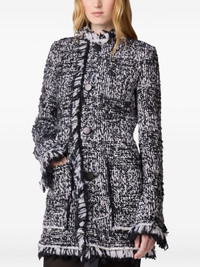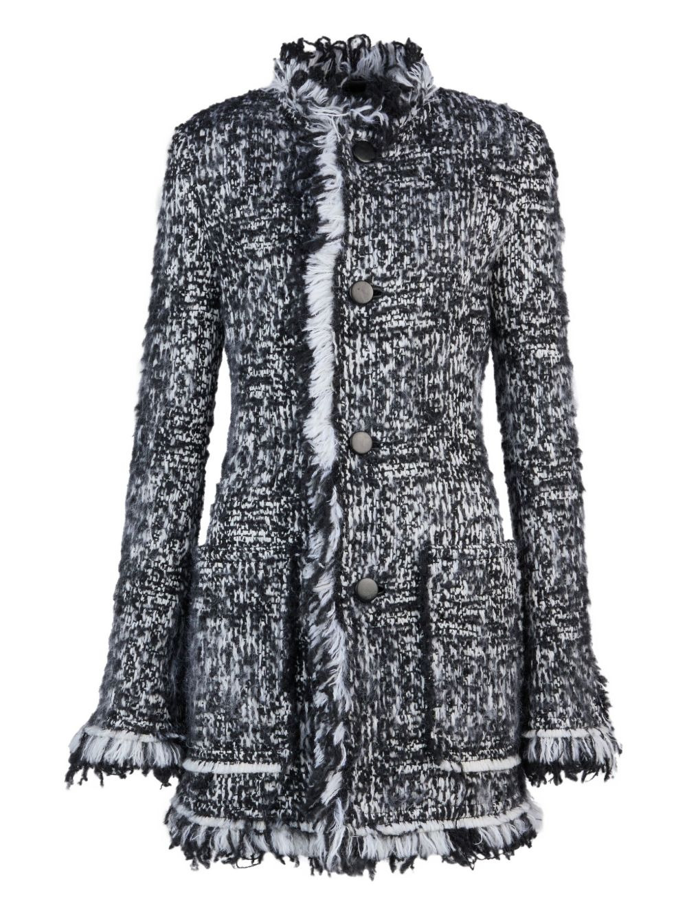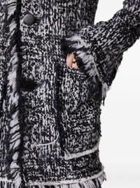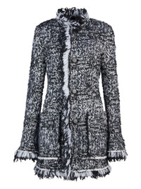 fringed coat Highlights - White and black - Fringed trim - Button fastening - Round neck - Front pockets Made in Italy Composition Outer: Virgin Wool 70%, Alpaca 25%, Polyamide 5% Lining: Viscose 100% Washing instructions Read Manufacturer Guidelines