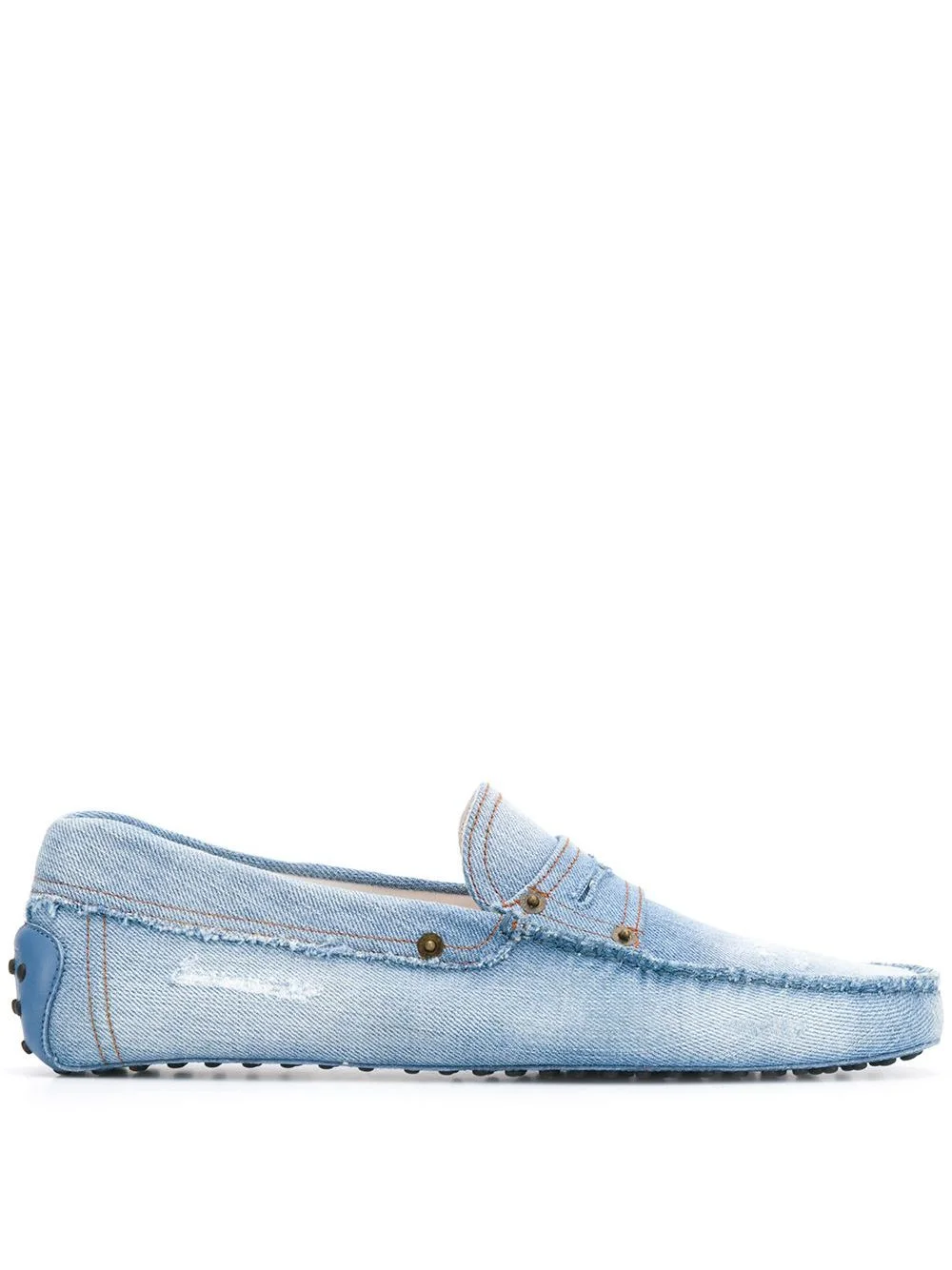 Gommino denim driving shoes For easy-to-wear looks that score high on desirability, look no further than the new Tod’s collection. These light blue Gommino denim driving shoes are crafted from cotton and leather and feature an almond toe, distressed effects, a slip-on style, a flat sole with rubber pebble detailing and contrast stitching. Made in Italy Composition Sole: Rubber 100%, Leather 100% Outer: Cotton 100% Lining: Leather 100% SIZE & FIT Measurement HEEL 0.59 in(1.5 cm)