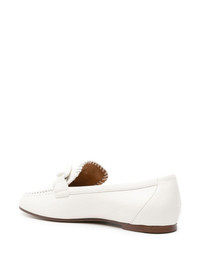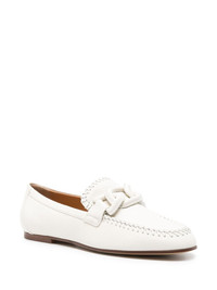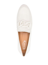 Kate leather loafers The hallmark chain links that appear across Tod's Kate collection run the gamut of interpretations – the ones at the vamp of these white loafers are made from matching leather. The whipstitching and braided trims nod to the brand’s longstanding reputation for fine craftsmanship. Highlights - White - Calf leather - Grained texture - Low stacked heel - Whipstitch trim - Chain-link detailing - Almond toe - Braided trim - Branded leather insole - Leather lining - Leather outsole - Slip-on style - This piece comes complete with a protective dust bag. Made in Italy Composition Outer: Calf Leather 100% Lining: Calf Leather 100% Sole: Calf Leather 100% SIZE & FIT Measurement HEEL 0.39 in(1 cm)