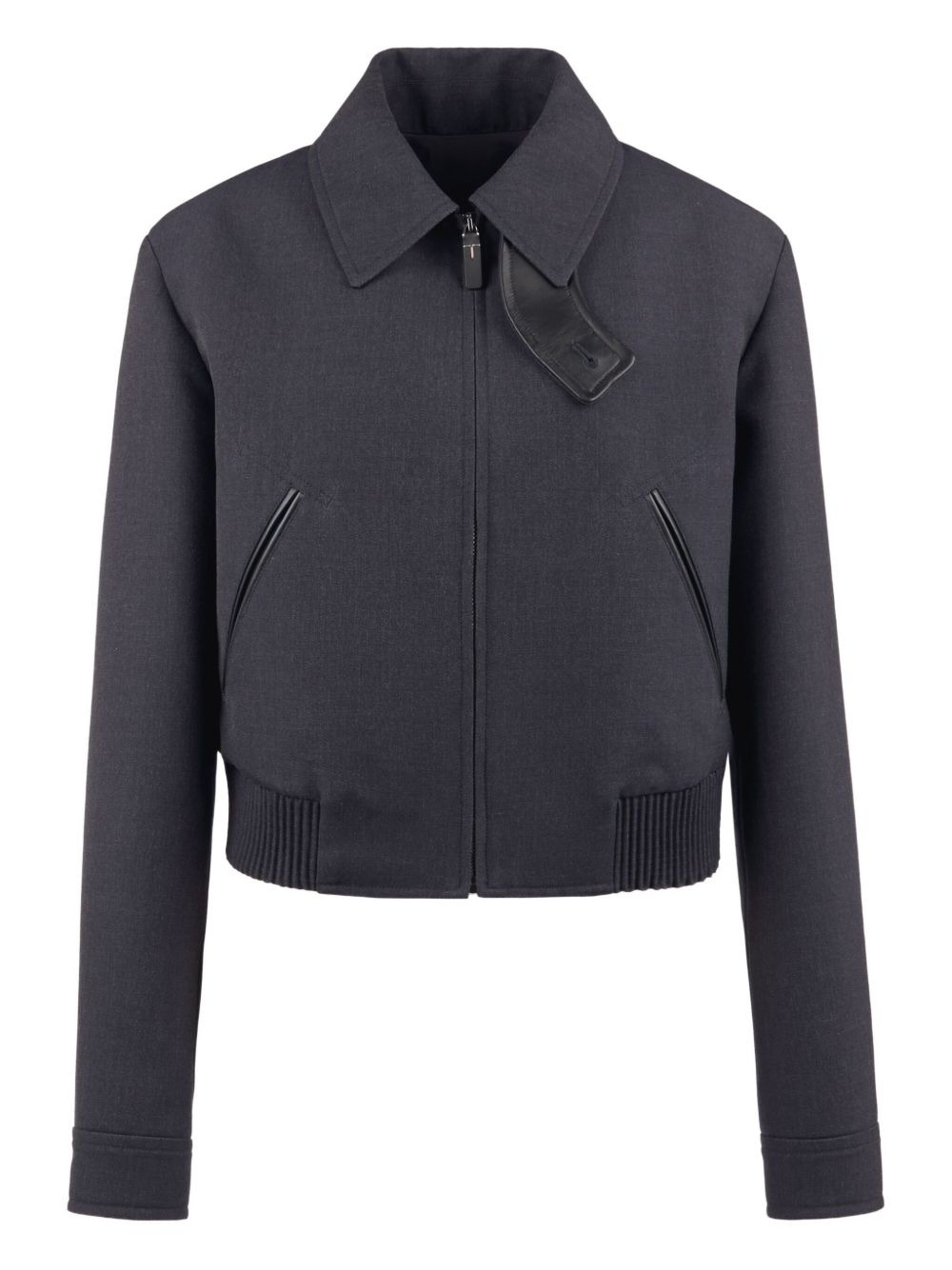 leather-trimmed bomber jacket Highlights - Dark-blue - Leather collar - Zip fastening - Cropped hem - Welt pockets - Ribbed cuffs Made in Italy Composition Virgin Wool 100% Washing instructions Read Manufacturer Guidelines