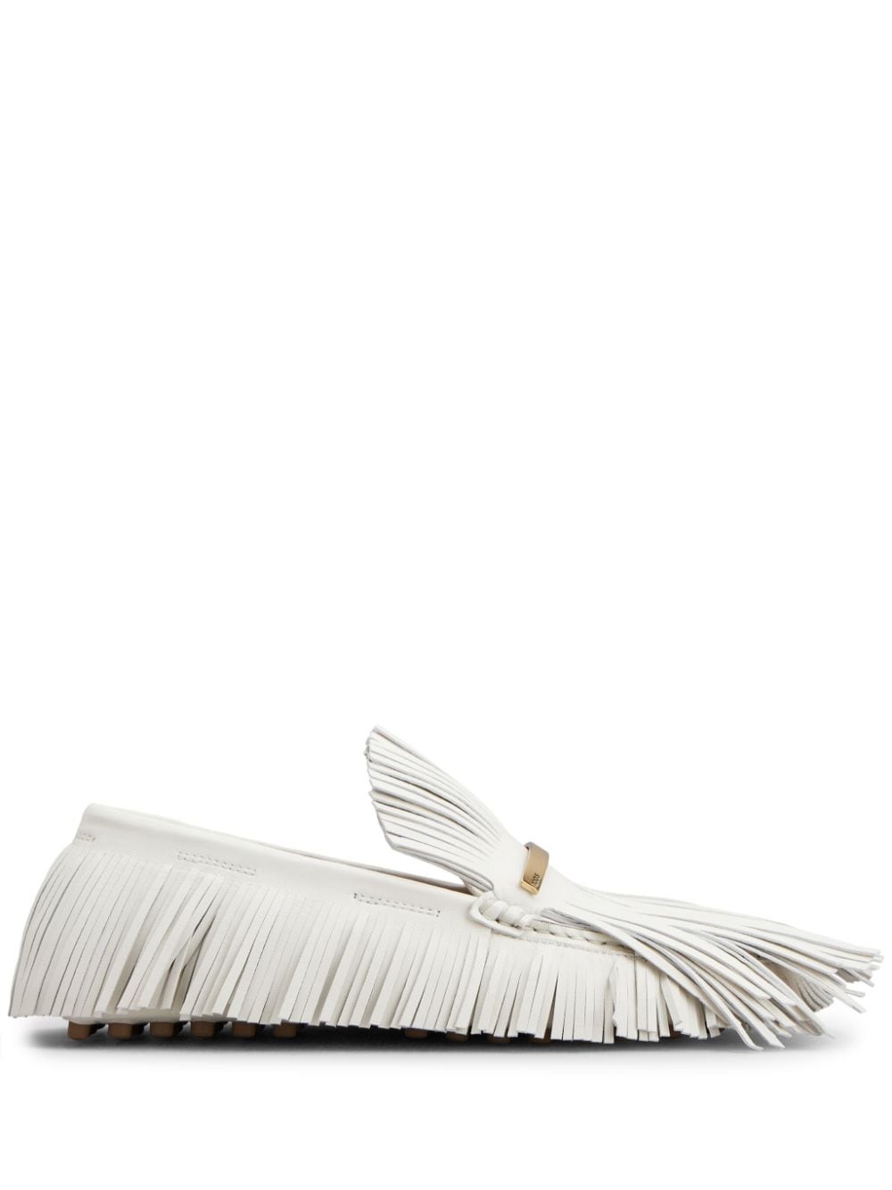 logo-plaque franged leather loafers Highlights - White - Calf leather - Smooth grain - All-over franged - Gold-tone logo plaque - Branded leather insole - Almond toe - Flat rubber sole - Slip-on style Made in Italy Composition Lining: Calf Leather 100% Sole: Rubber 100%, Calf Leather 100% Outer: Calf Leather 100%