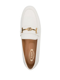 logo-plaque leather loafers A true icon of Italian design, Tod's loafers are crafted with quality and timelessness in mind. This pair is rendered in white leather to an almond toe silhouette with a gold-tone logo plaque at the upper. Highlights - White - Calf leather - Gold-tone logo plaque - Almond toe - Branded leather insole - Flat sole Made in Italy Composition Sole: Calf Leather 100% Outer: Calf Leather 100% Lining: Calf Leather 100% SIZE & FIT Measurement HEEL 0.78 in(2 cm)
