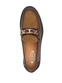 logo-plaque panelled loafers Following Tod's supreme craftsmanship and quality, these loafers are presented in a panelled design. While the sides are made with dark brown leather, the upper is made with light brown suede. A gold-tone logo plaque completes the look. Highlights - Brown - Calf leather/calf suede - Panelled design - Gold-tone logo plaque - Branded leather insole - Flat sole Made in Italy Composition Leather 100% SIZE & FIT Measurement HEEL 0.98 in(2.5 cm) Sole height 0.39 in(1 cm)