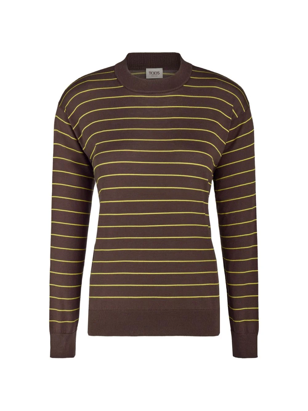 long-sleeve striped sweater Highlights - Brown and yellow - Striped - Long sleeves - Ribbed trims - Round neck Made in Italy Composition Silk 98%, Elastane 2% Washing instructions Read Manufacturer Guidelines