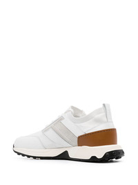 Maglia low-top sneakers Inspired by the running world with an urban vocation, these sneakers from Tod's are ergonomic and comfortable. The rubber outsole features a tread composed of different-sized rubber pebbles. Highlights - White/camel brown - Calf leather - Panelled design - Sock-style ankle - Round toe - Front lace-up fastening - Chunky rubber sole - Signature gommino sole Made in Italy Composition Lining: Fabric 100% Sole: Rubber 100% Outer: Calf Leather 100%, Fabric 100% SIZE & FIT Measurement HEEL 1.37 in(3.5 cm) Sole height 0.59 in(1.5 cm)