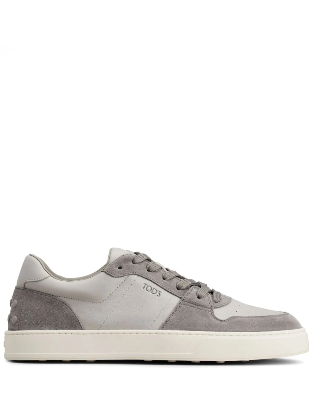 panelled suede sneakers Highlights - Medium grey/light grey - Calf leather - Suede panelling - Panelled design - Logo stamp at side - Embossed detail - Round toe - Front lace-up fastening - Perforated toebox - Branded leather insole - Flat rubber sole Made in Italy Composition Sole: Rubber 100% Lining: Calf Leather 100% Outer: Calf Suede 100%, Calf Leather 100%