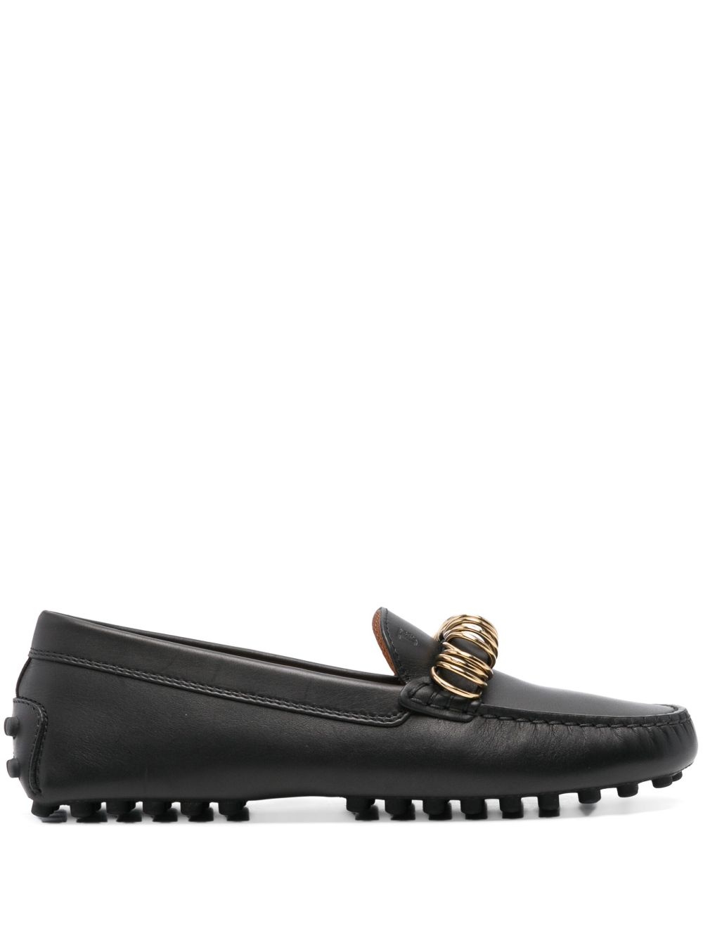 ring-embellished loafers Highlights - Black - Rubber sole - Branded leather insole - Moc stitching - Almond toe Made in Italy Composition Lining: Calf Leather 100% Sole: Calf Leather 100%, Rubber 100% Outer: Calf Leather 100%