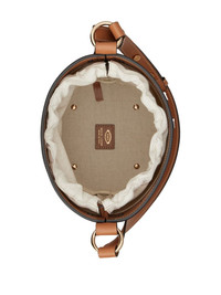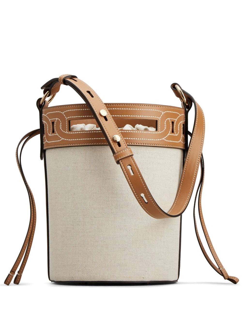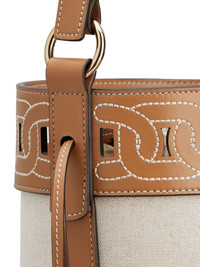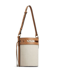 small Kate panelled bucket bag Highlights - Light beige/caramel brown - Calf leather - Linen/flax - Colour-block panelled design - Decorative stitching - Adjustable top handle - Top drawstring fastening - Main compartment - Metal feet Made in Italy Composition Outer: Cotton 100%, Calf Leather 100% Linen/Flax 100% SIZE & FIT Measurement DEPTH 6.88 in(17.5 cm) WIDTH 6.88 in(17.5 cm) HEIGHT 9.05 in(23 cm)