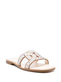 studded leather sandals Tod’s demonstrates its affinity for traditional Italian craftsmanship with these sandals. The front strap is sculpted from leather to mimic the brand’s signature logo and is adorned with silver-tone studs. Highlights - Cream white/camel brown - Calf leather - Stud embellishment - Silver-tone hardware - Slip-on style - Square open toe - Logo-shaped toe strap - Branded footbed - Low stacked heel - Leather outsole - This piece comes complete with a protective dust bag. Made in Italy Composition Outer: Calf Leather 100% Sole: Calf Leather 100% Lining: Calf Leather 100% SIZE & FIT Measurement HEEL 0.59 in(1.5 cm)