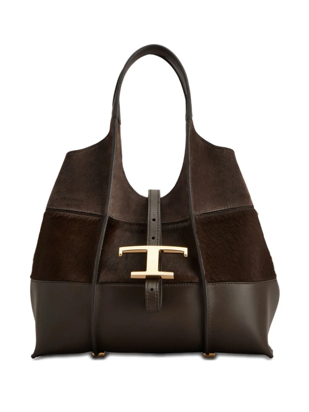 T-buckle suede leather tote bag Highlights - Dark brown - Suede leather - Calf leather - T-buckle fastening - Detachable shoulder strap - Internal pouch Made in Italy Composition Leather 100%