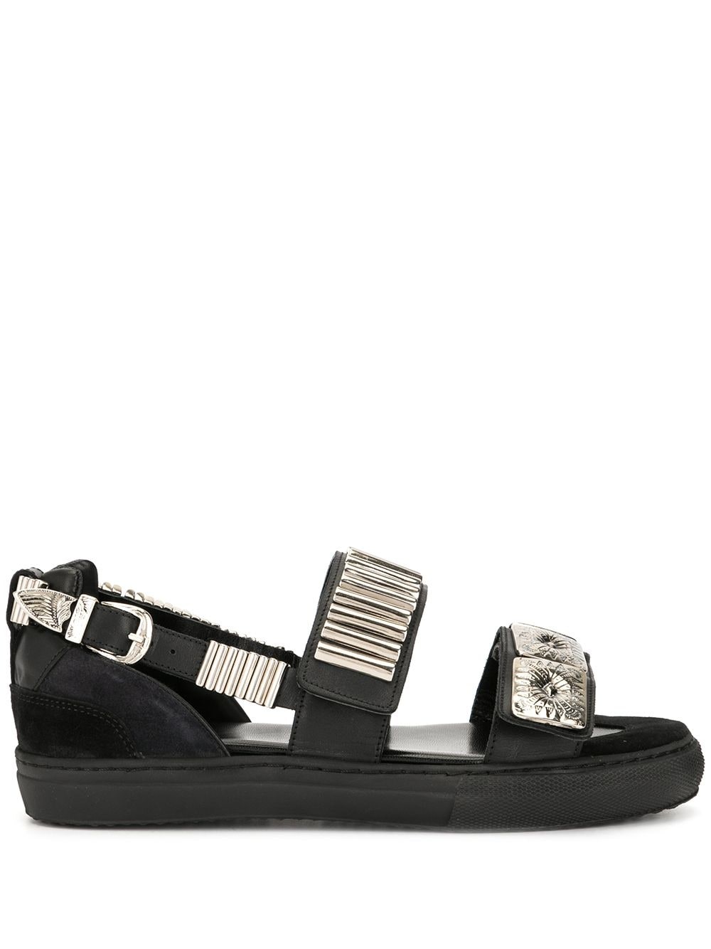 embellished flat sandals Black leather embellished flat sandals from Toga Pulla featuring a flat rubber sole, a strap closure, silver-tone hardware and an open toe. Imported Composition Calf Leather 100% SIZE & FIT Measurement Sole height 0.98 in(2.5 cm)