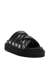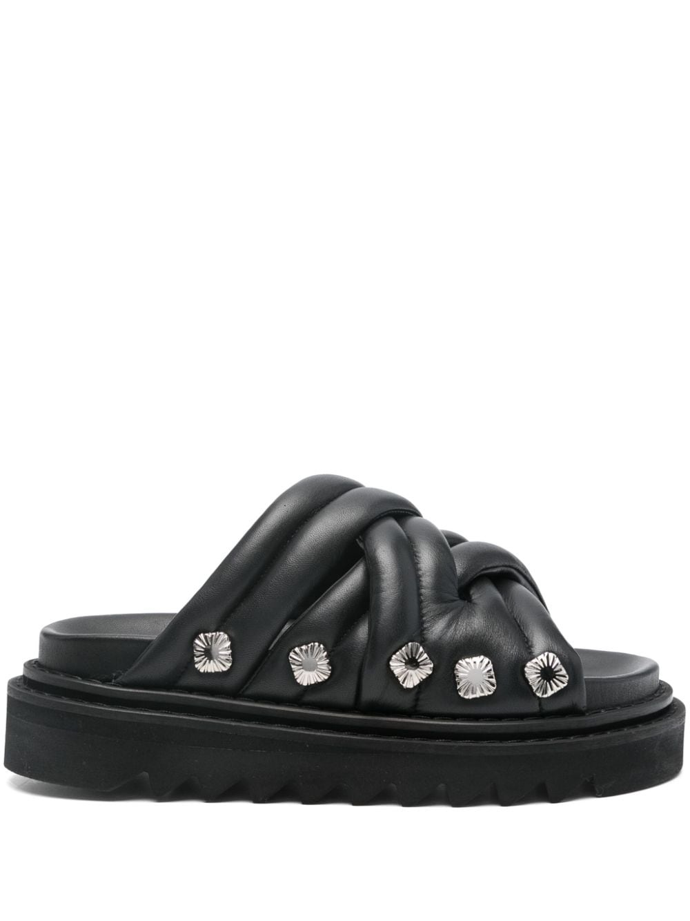 padded sandals Highlights - Black - Goatskin - Smooth grain - Padded design - Crossover strap detail - Stud embellishment to the side - Asymmetric open toe - Branded leather insole - Ridged rubber sole Imported Composition Leather 100% SIZE & FIT Measurement HEEL 1.57 in(4 cm) Sole height 1.18 in(3 cm)