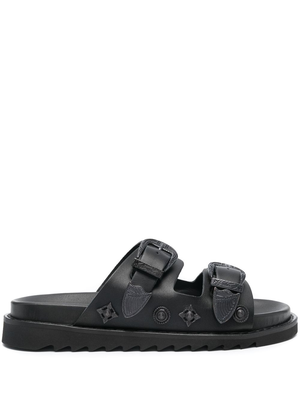 stud-embellished leather slides Highlights - Black - Leather - Tonal design - Stud embellishment - Double-strap design - Open toe - Round toe - Branded insole - Slip-on style - Flat rubber sole Imported Composition Leather 100% SIZE & FIT Measurement Sole height 0.78 in(2 cm) HEEL 1.18 in(3 cm)