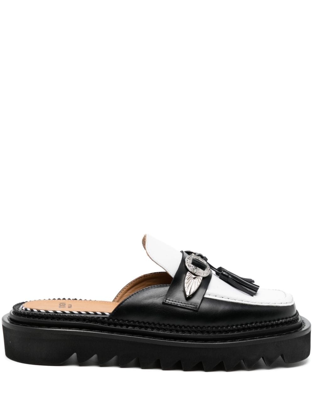 tassel-detail leather mules Highlights - White/black - Calf leather - Panelled design - Tassel detail - Silver-tone hardware - Slip-on style - Round toe - Branded insole - Flat rubber sole Imported Composition Leather 100% SIZE & FIT Measurement HEEL 1.18 in(3 cm) Sole height 0.98 in(2.5 cm)