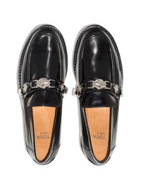 buckled strap loafers Known for their modern embellished takes on classic footwear, Toga Virilis introduces another bold pair of shoes for SS22. These black penny loafers stand out thanks to an embellished brooch to the front and silver-tone hardware decorating the heel. Highlights - These black toga virilis embellished strap leather loafers are made in portugal. they feature a round toe, a strap with silver tone hardware, a logo branded footbed and a ridged sole with metal cap. what does one wear to the national golden spur awards? these mid-western loafers from toga virilis. maybe leave the ten-gallon hat at home, though. Imported Composition Outer: Calf Leather 100% Lining: Calf Leather 100% Sole: Calf Leather 100% SIZE & FIT Model measurements Height 6 ft 1 in(1.86 m) Bust/Chest 37.4 in(95 cm) Hips 36.22 in(92 cm) Waist 29.52 in(75 cm) FittingInformation This piece fits small – take one size up Measurement HEEL 1.18 in(3 cm) Sole height 0.39 in(1 cm)