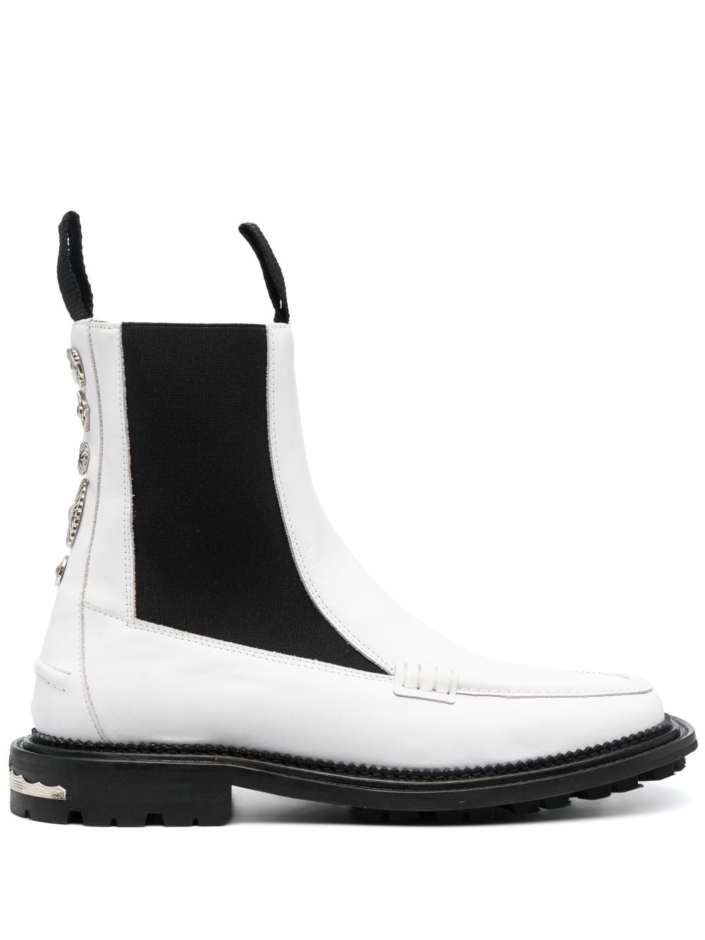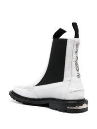 charm-detail ankle leather boots Highlights - White - Leather - Charm detail - Square toe - Double pull-tab at the opening - Elasticated side panels - Ankle-length - Flat rubber sole Imported Composition Outer: Leather 90%, Elastane 10% Lining: Leather 100% Sole: Rubber 100% SIZE & FIT Measurement HEEL 1.18 in(3 cm) Sole height 0.78 in(2 cm) HEIGHT 6.88 in(17.5 cm)