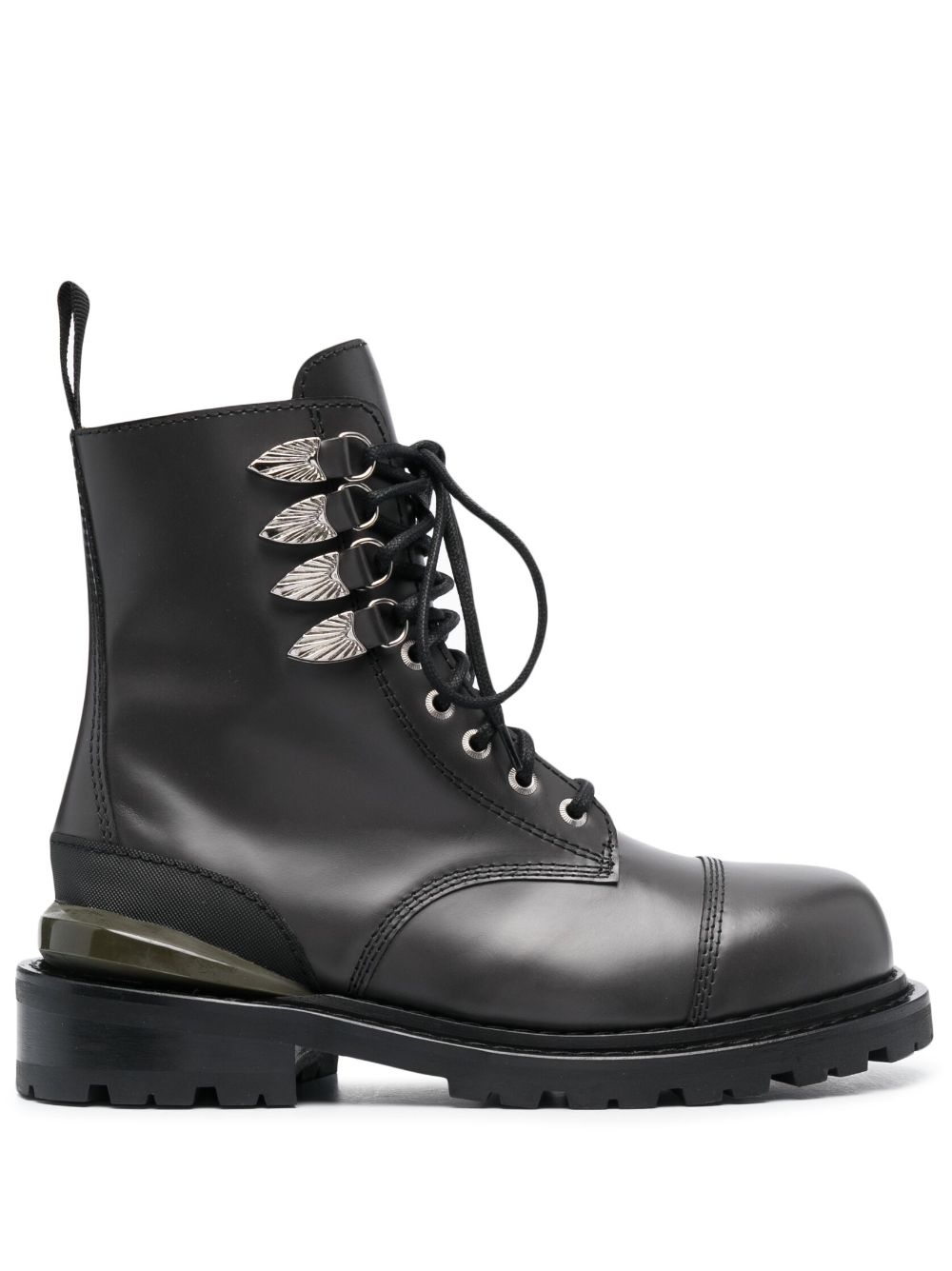 Side Gore leather ankle boots Highlights - Dark grey - Leather - Silver-tone stud detailing - Pull-tab at the heel - Round toe - Front lace-up fastening - Rubber sole - Ankle-length Imported Composition Outer: Leather 100% Lining: Leather 100% Sole: Rubber 100% SIZE & FIT Measurement HEEL 1.77 in(4.5 cm) HEIGHT 6.88 in(17.5 cm) Sole height 1.18 in(3 cm)