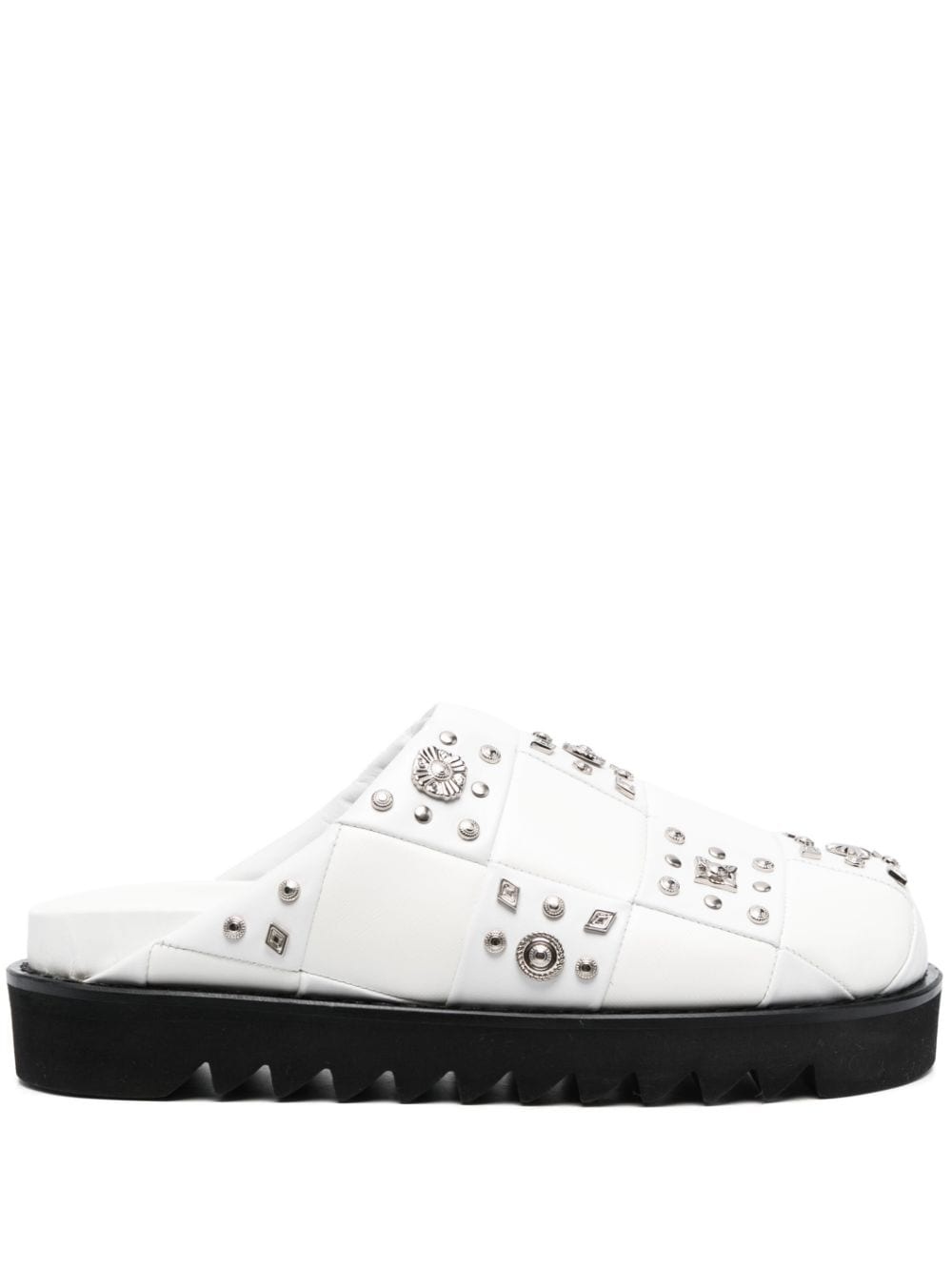 stud-embellished leather slippers Highlights - White - Leather - Silver-tone stud embellishment - Round toe - Slip-on style - Branded insole - Ridged rubber sole Imported Composition Outer: Leather 100% Lining: Leather 100% Sole: Rubber 100% SIZE & FIT Measurement HEEL 1.96 in(5 cm) Sole height 0.98 in(2.5 cm)