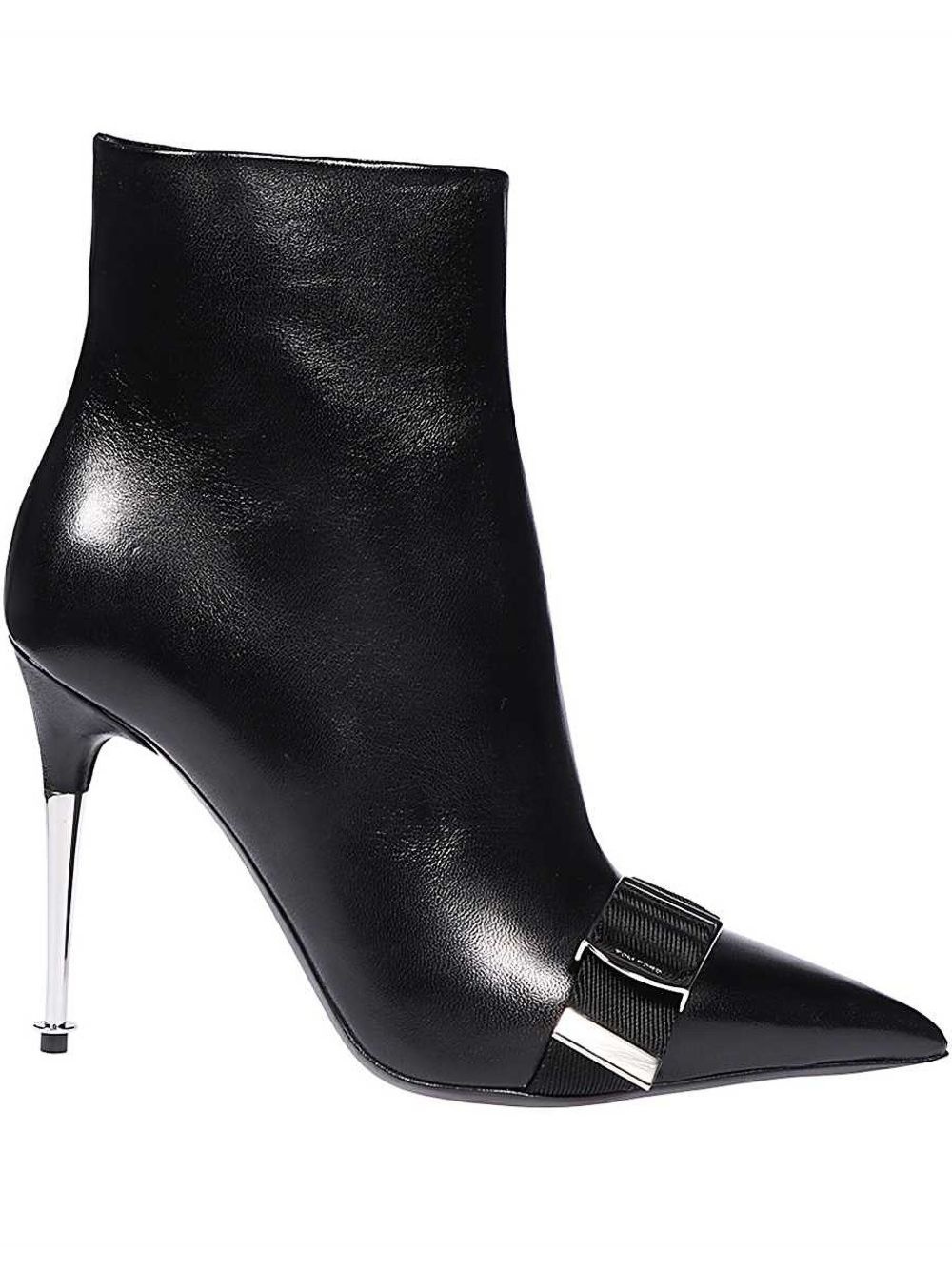 110mm leather ankle boots Highlights - Black - Side zip fastening - High stiletto heel - Pointed toe - Decorative buckle detail Made in Italy Composition Outer: Calf Leather 100%, Sheepskin 85%, Steel 5%, Brass 5%, Polyester 5% Lining: Leather 100% Sole: Leather 100% SIZE & FIT Measurement HEEL 4.33 in(11 cm)