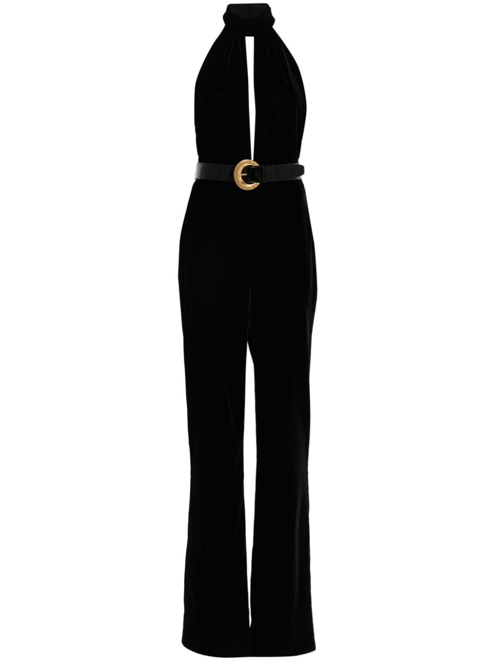 belted velvet jumpsuit Highlights - Black - Velvet - Detachable waist belt - Rear hook and eye fastening - Concealed rear hook and zip fastening - Halterneck - Cut-out detailing - Sleeveless - Open back - Straight leg Made in Italy Composition Outer: Bos Taurus 100%, Viscose 66%, Cupro 31%, Elastane 3% Lining: Silk 92%, Elastane 8% Washing instructions Dry Clean Only