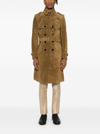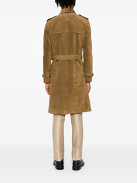 Buttery suede trench coat Highlights - Olive brown - Double-breasted button fastening - Two side welt pockets - Detachable and adjustable waist belt - Belt loops Made in Italy Composition Lining: Cotton 56%, Viscose 44% Outer: Calf Suede 100% SIZE & FIT Model measurements Height 6 ft 3 in(1.9 m) Bust/Chest 35.03 in(89 cm) Hips 36.61 in(93 cm) Waist 29.13 in(74 cm) FittingInformation Designed to be unstructured, offering a loose fit throughout The belt offers adjustability for fitted preferences Soft leather has a supple and smooth construction offering some flexibility