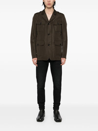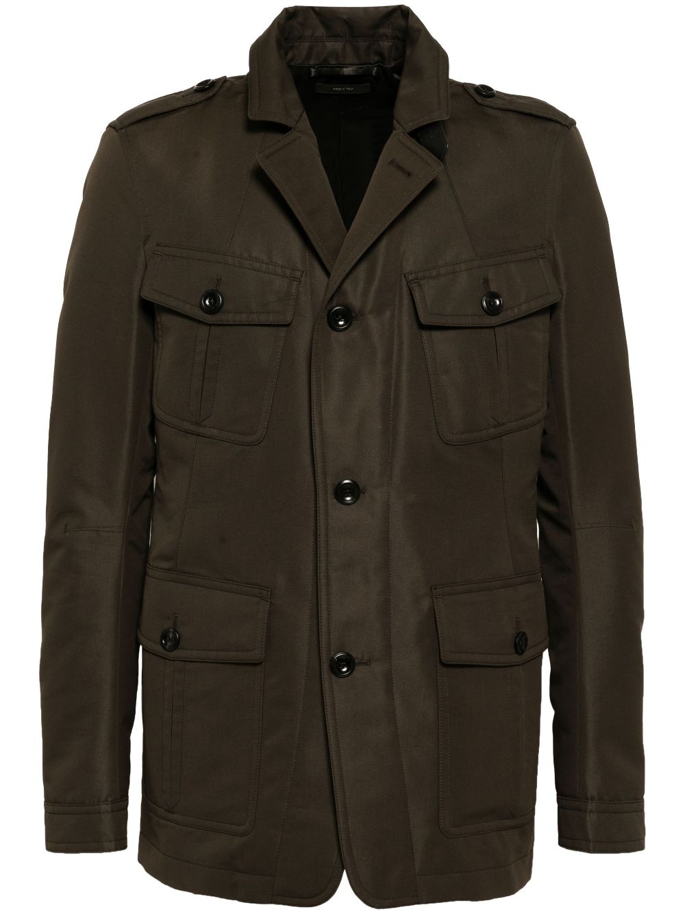button-up military jacket Highlights - Olive brown - Front button fastening - Four front button-fastening pockets - Rear slit Made in Italy Composition Cotton 62%, Polyester 38% SIZE & FIT Model measurements Height 6 ft 2 in(1.87 m) Bust/Chest 33.07 in(84 cm) Hips 35.43 in(90 cm) Waist 26.77 in(68 cm) FittingInformation Designed to be unstructured, offering a loose fit throughout The vented hem offers movement at the rear Made from a midweight non-stretch fabric