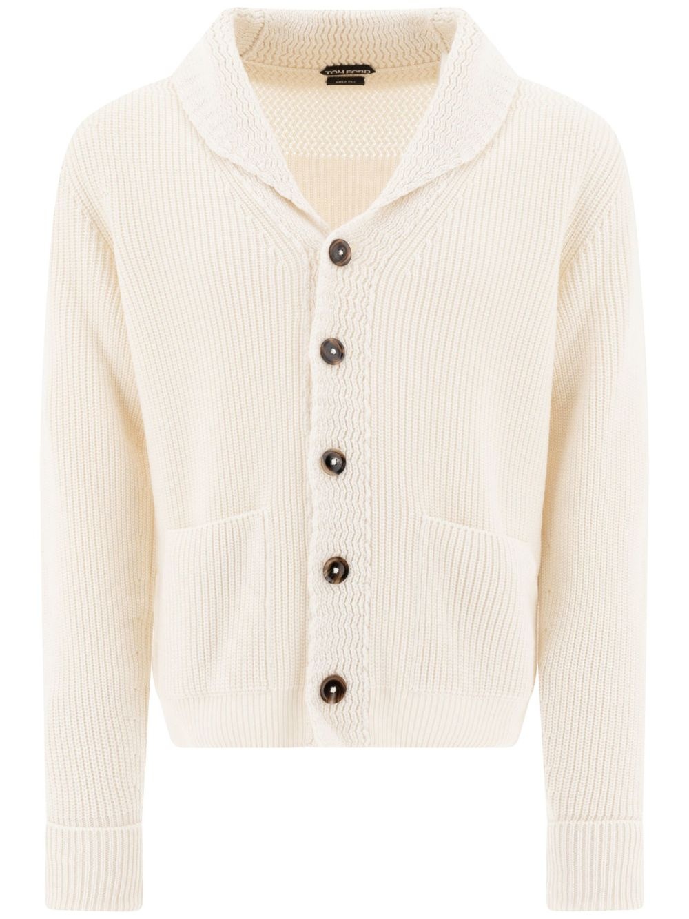 cashmere cardigan Highlights - Light beige - Front button fastening - Two front patch pockets - Shawl collar - Long sleeves Made in Italy Composition Cashmere 100% SIZE & FIT FittingInformation Designed for a slim fit, offering a comfortable fit that sits just away from the body Made with a midweight knit, this piece offers some stretch Washing instructions Read Manufacturer Guidelines