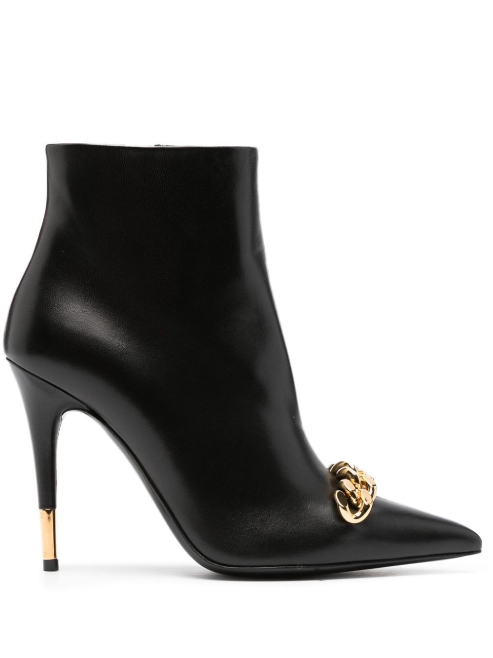chain-detail leather ankle boots TOM FORD leans into a refined approach to design with these ankle boots made from smooth black calf leather. The luxurious nature of the brand is showcased with a chunky gold-tone chain detail adorning the toe and a leg-lengthening high stiletto heel. Highlights - Black - Calf leather - Smoothing finish - Chain-link detailing - Pointed toe - Side zip fastening - Branded leather insole - 105mm stiletto heel - Gold-tone hardware Made in Italy Composition Outer: Calf Leather 100% Lining: Calf Leather 100% Sole: Calf Leather 100% SIZE & FIT Measurement CIRCUMFERENCE 10.23 in(26 cm) HEEL 4.33 in(11 cm) HEIGHT 4.13 in(10.5 cm) Sole height 0.39 in(1 cm)