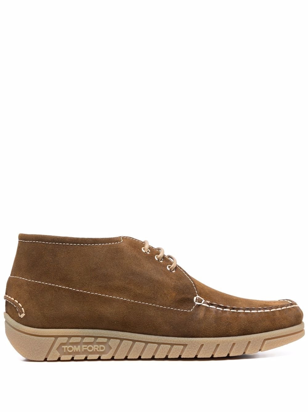 contrasting suede ankle boots Designed by Tom Ford, these boat shoes are adorned with contrasting white stitching. The tan-brown suede construction is in line with the brand's sophisticated style. Made in Italy Composition Outer: Calf Leather 100% Sole: Rubber 100% Lining: Calf Leather 100% SIZE & FIT Measurement HEEL 1.57 in(4 cm)