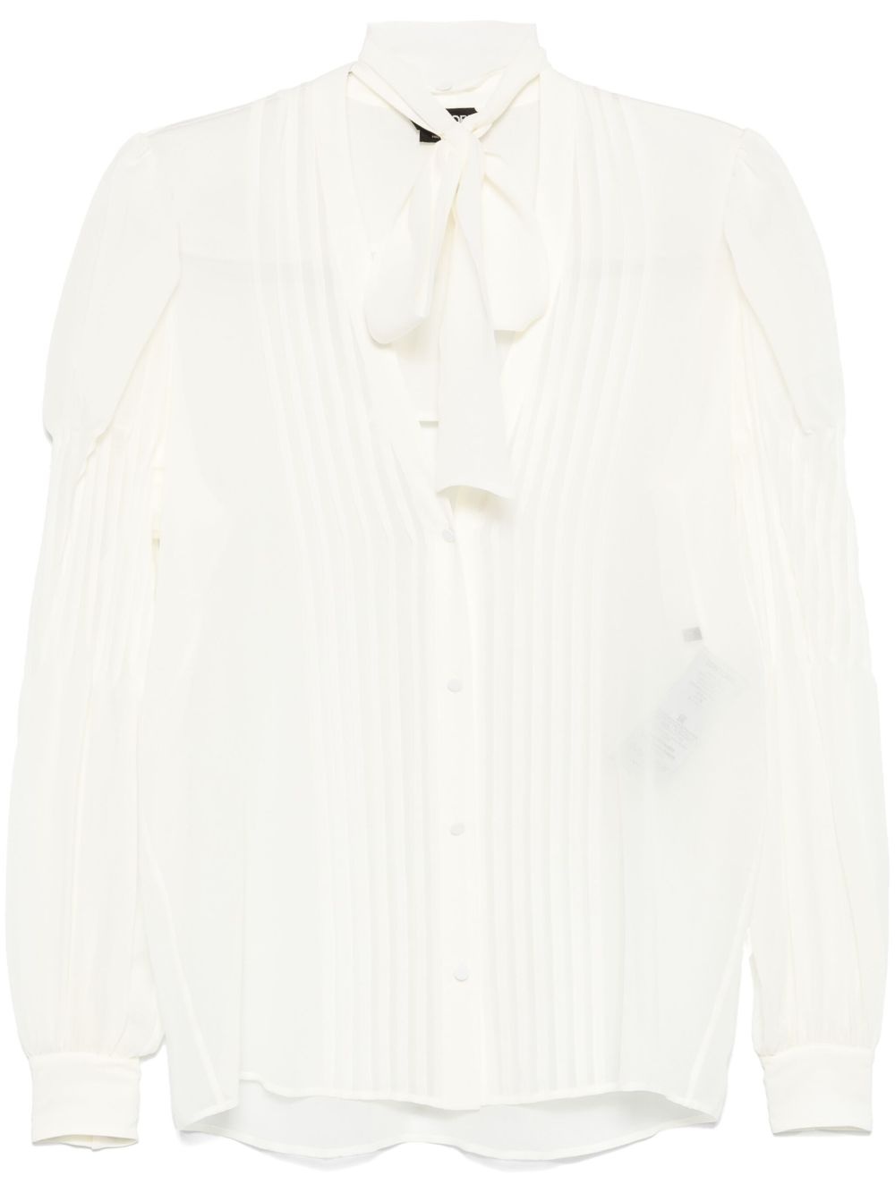 crepe shirt Highlights - Light beige - Front button fastening - Attached scarf - Pintuck detailing - Long puff sleeves Made in Italy Composition Silk 100% SIZE & FIT Model measurements Height 5 ft 10 in(1.78 m) Bust/Chest 33.46 in(85 cm) Hips 36.22 in(92 cm) Waist 23.22 in(59 cm) FittingInformation Designed to be unstructured, offering a loose fit throughout The tie fastening gives an adaptable and personalised fit Made from a lightweight non-stretch fabric