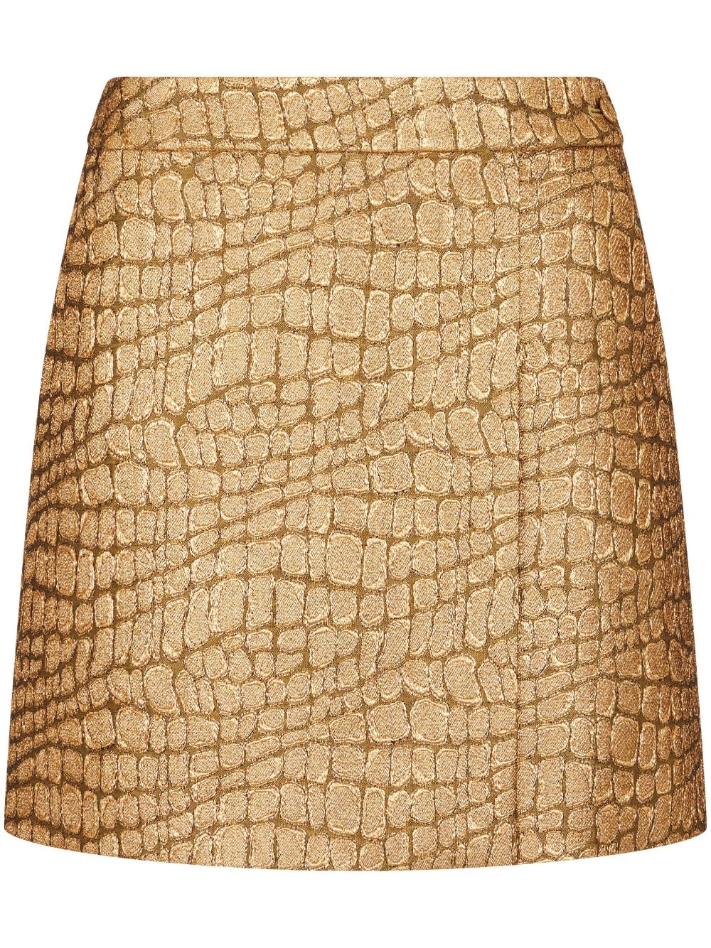 crocodile-jacquard mini skirt Highlights - Gold-tone - Crocodile patterned jacquard - Wrap design - Side button fastening - Two side inset pockets - Thigh-length - Straight hem - Full lining Made in Italy Composition Acrylic 45%, Acetate 41%, Polyester 14% Washing instructions Read Manufacturer Guidelines