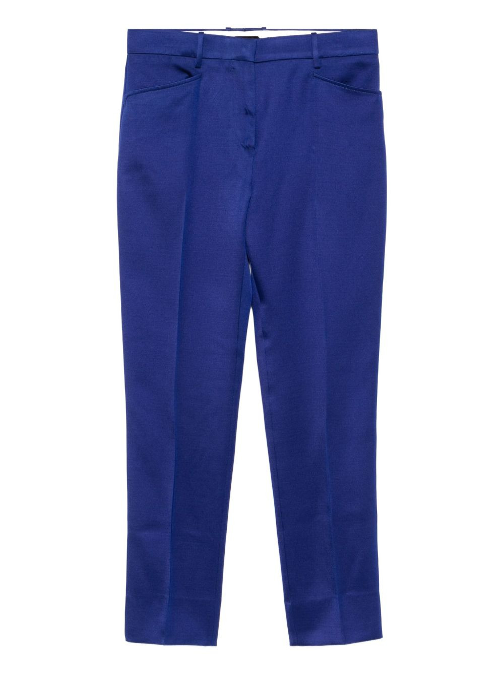 cropped straight-leg trousers Highlights - Royal blue - Concealed front button, hook and zip fastening - Two side inset pockets - Two rear jetted pockets Imported Composition Lining: Cupro 59%, Silk 41% Outer: Silk 51%, Wool 49% SIZE & FIT Model measurements Height 5 ft 10 in(1.78 m) Bust/Chest 31.88 in(81 cm) Hips 37 in(94 cm) Waist 25.19 in(64 cm) FittingInformation Designed with a cigarette cut, these trousers allow for a close fit at the waist and offer an unrestricted fit through to the ankle Made from a midweight non-stretch fabric Washing instructions Dry Clean Only