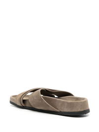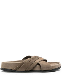 crossover logo-strap slides forest green calf suede perforated logo detail crossover strap at the toe open toe open back slip-on style flat rubber sole Made in Italy Composition Outer: Calf Suede 100% Lining: Calf Suede 100% Sole: Rubber 100% SIZE & FIT Measurement HEEL 1.37 in(3.5 cm) Sole height 0.78 in(2 cm)