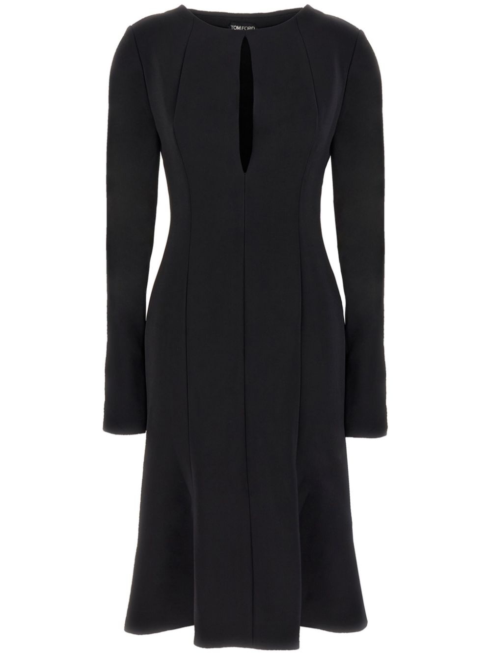 cut-out dress Highlights - Black - Cut-out detailing - Rear zip fastening - Round neck - Long sleeves - Flared skirt - Mid-length Made in Italy Composition Outer: Viscose 97%, Spandex/Elastane 3% Lining: Silk 92%, Elastane 8%