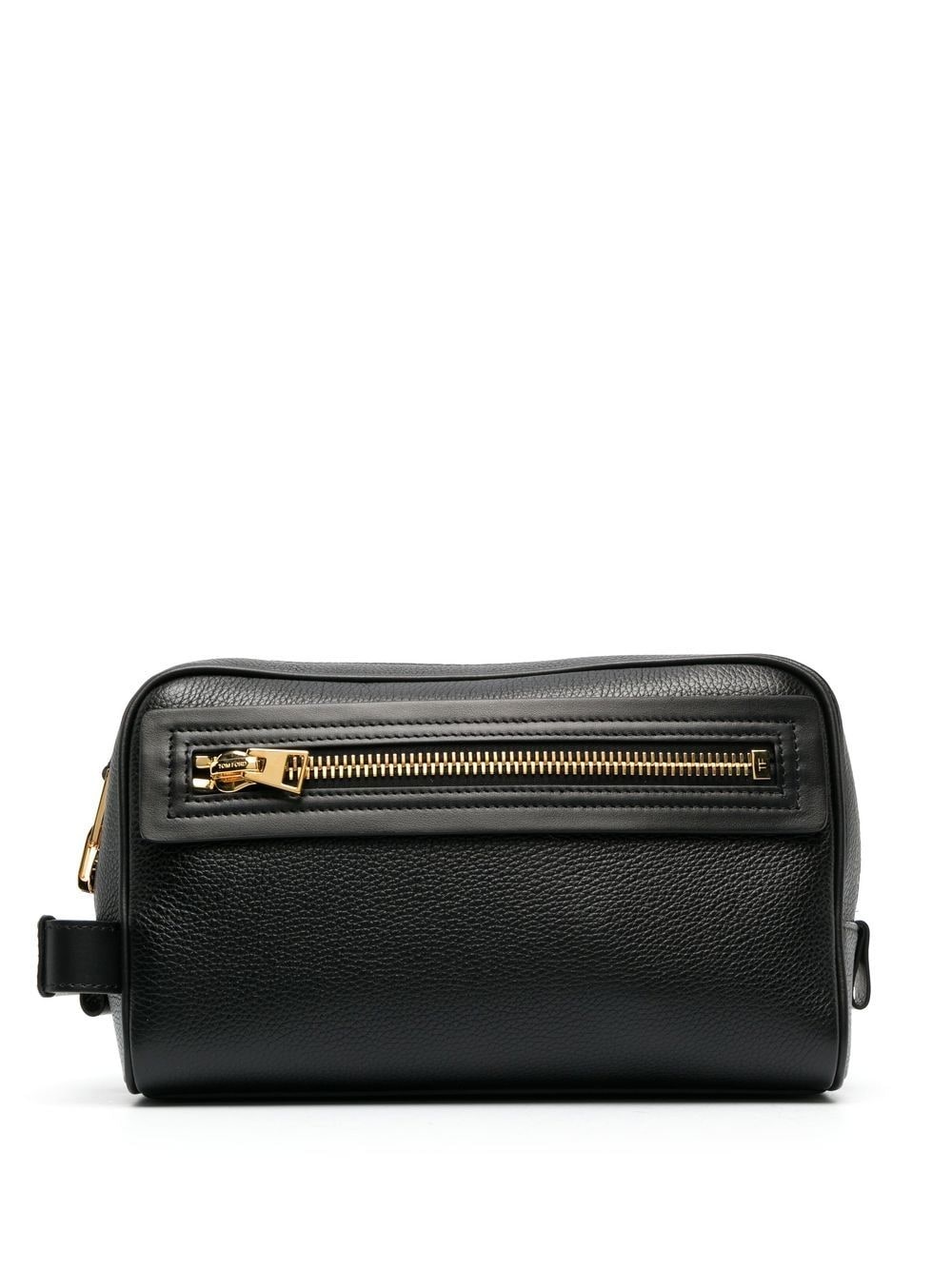 debossed logo wash bag Channelling Tom Ford's penchant for craftsmanship and timeless silhouettes, this black wash bag is made from smooth calf leather worked into a grained finish that seamlessly complements its gold-tone hardware. Benefiting from a handle at the side, this accessory is decorated with a debossed logo at the front. Made in Italy Composition Outer: Calf Leather 100%, Brass 100% Lining: Cotton 90%, Acrylic 10% SIZE & FIT Measurement DEPTH 3.93 in(10 cm) HANDLE 1.57 in(4 cm) HEIGHT 5.9 in(15 cm) WIDTH 9.84 in(25 cm)