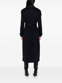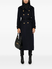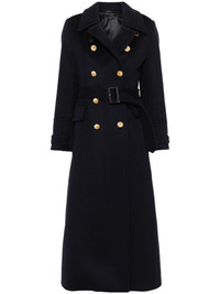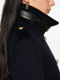 double-breasted military coat Highlights - Navy blue - Virgin wool - Non-brushed fleece - Double-breasted button fastening - Throat latch - Notched lapels - Epaulettes - Long sleeves with buttoned cuffs - Belt loops - Detachable waist belt - Two front flap pockets - Central rear vent - Straight hem - Long length Made in Italy Composition Outer: Virgin Wool 100%, Bos Taurus 100% Lining: Cotton 56%, Viscose 44% SIZE & FIT Model measurements Height 5 ft 10 in(1.77 m) Bust/Chest 30.7 in(78 cm) Hips 35.03 in(89 cm) Waist 23.62 in(60 cm) FittingInformation Designed for a slim fit that sits just away from the body offering a close yet comfortable fit The belt offers adjustability for fitted preferences Made from a midweight non-stretch fabric