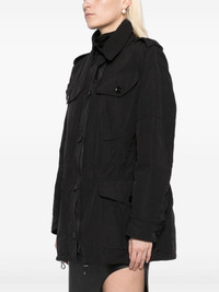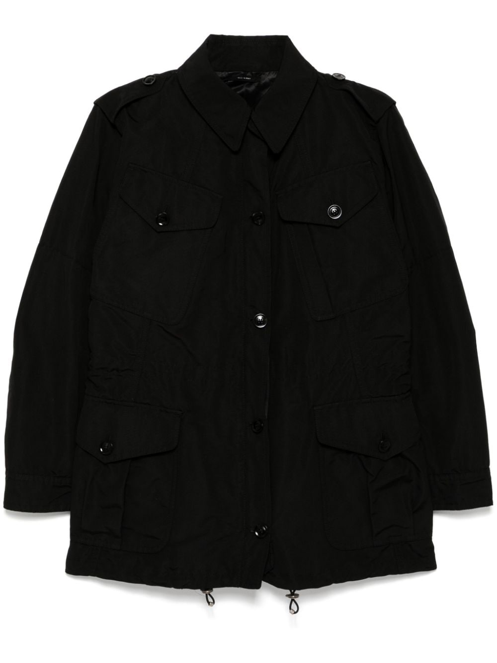 drawstring waist military jacket Highlights - Black - Cotton blend - Front button and zip fastening - Spread collar - Epaulettes - Four front flap pockets - Drawstring waist - Buttoned cuffs - Long sleeves - Drawstring hem Made In Italy Composition Silk 100% SIZE & FIT Model measurements Height 5 ft 9 in(1.76 m) Bust/Chest 31.1 in(79 cm) Hips 35.03 in(89 cm) Waist 24.4 in(62 cm) FittingInformation Designed to be unstructured, offering a loose fit throughout The adjustable drawstring means that you can adjust this piece’s fit to suit your comfort and preference Made from a midweight non-stretch fabric